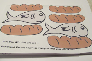 For their craft, the girls made a great card with this month's scripture verse. On the front is the two fish and five loaves of bread and inside is the verse. They can set it by their bed to read each evening. It's a great way for them to learn their verse.